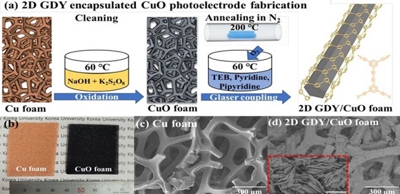 연구팀은 구리 폼(Cu foam)을 산화시켜 산화구리 폼(CuO foam)을 제작한 뒤, 2차원 GDY를 합성하여 2D GDY/CuO foam 이종접합 광전극을 구현하였다. 이를 활용해 태양광 기반 수소 생산 실험을 진행했으며, 동시에 밀도범함수 이론(Density Functional Theory, DFT)을 적용하여 실험과 이론을 정합함으로써 연구 결과의 타당성을 입증하였다.